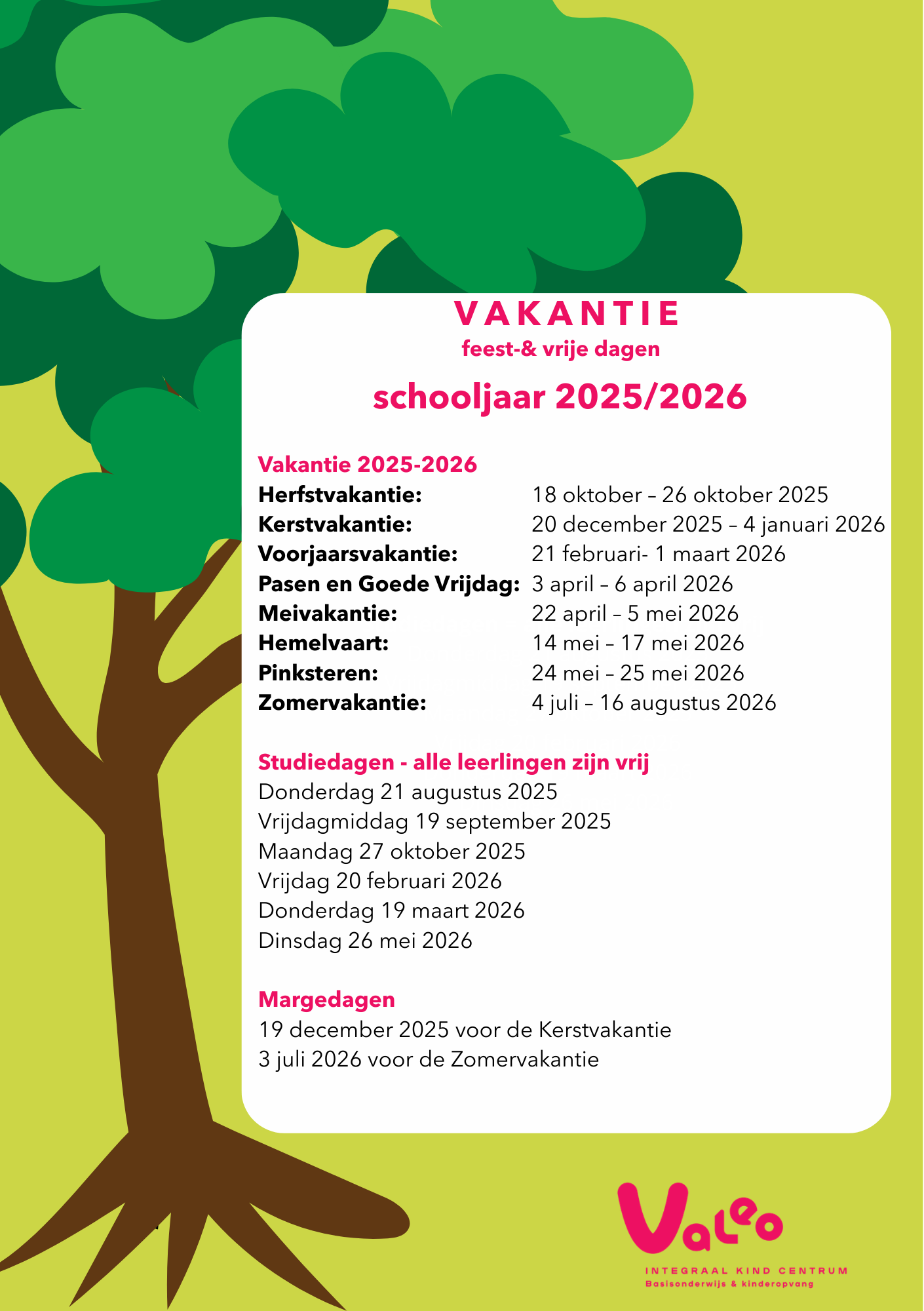 De vakanties, studie- en margedagen vallen op onderstaande dagen. Eventuele wijzigingen ziet u altijd op ons ouderportaal. Op studiedagen vergaderen de leerkrachten en zijn de leerlingen vrij. Op een margedag zijn kinderen en leerkrachten vrij.